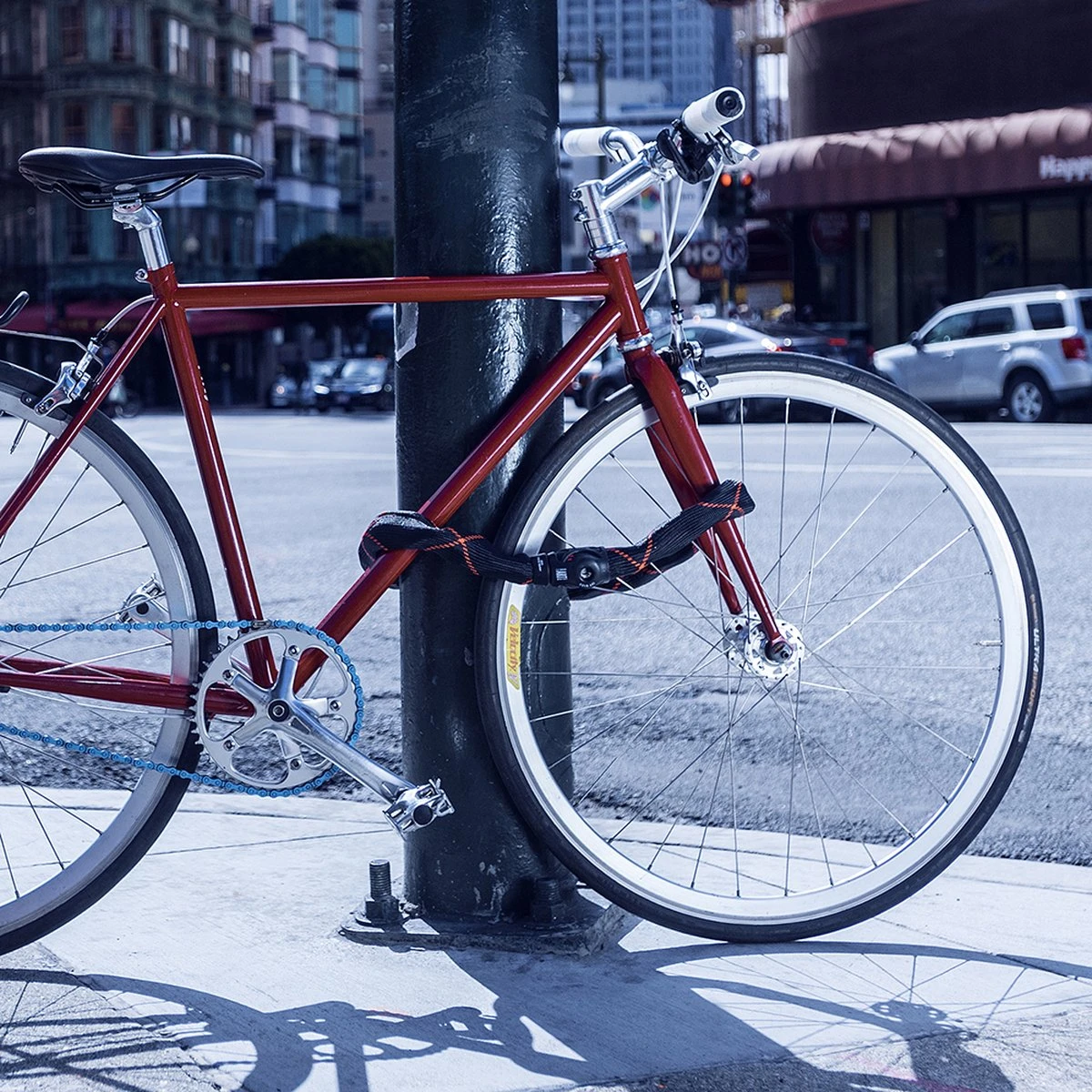 Het slot heeft een 10 mm dikke vierkante schakel gemaakt van speciaal gehard staal en is verkrijgbaar in 85 cm (2440 gram), 110 cm (3000 gram), 140 cm (3650 gram) en 170 cm (4400 gram)