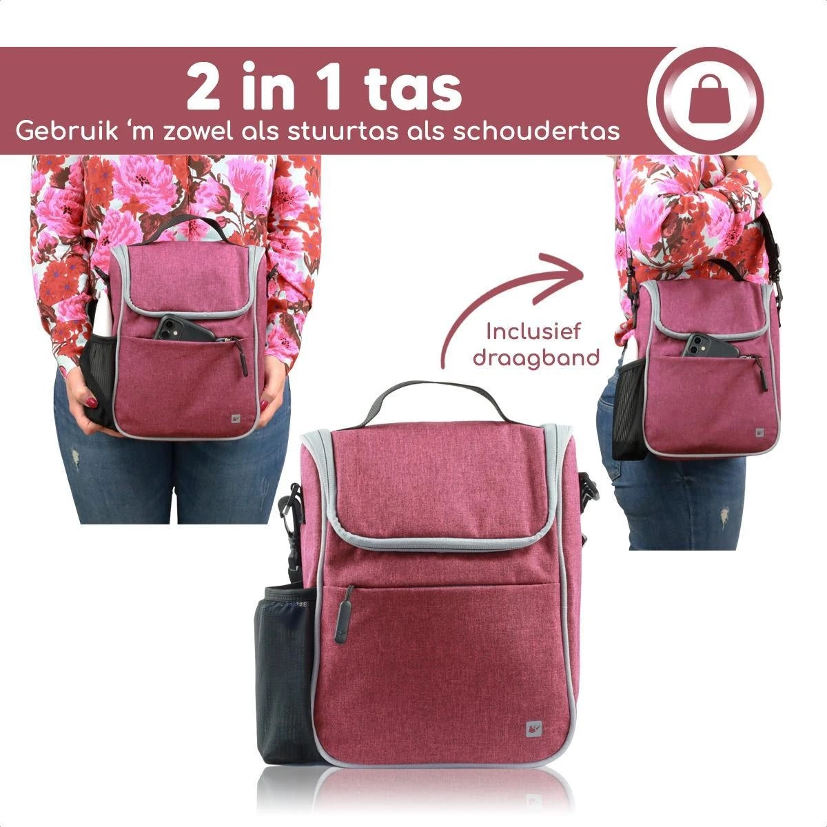 De tas heeft verschillende vakjes en ritsen, waardoor het georganiseerd blijft in je tas. Nooit meer zoeken in je tas naar je telefoon, flesje, oortjes etc.