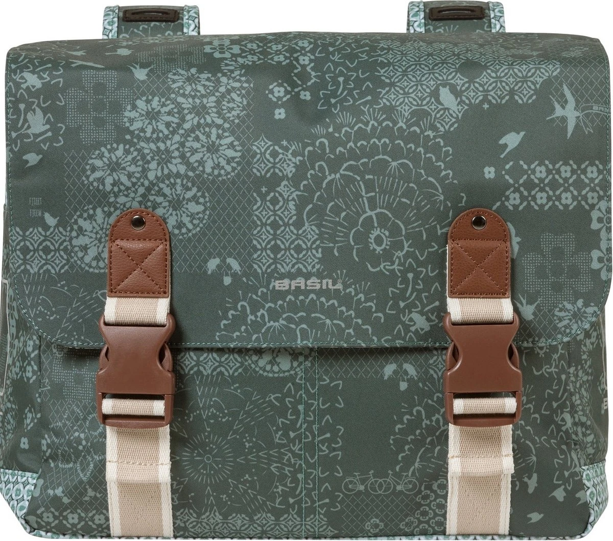 De Basil Bohè;me Double Bag is een dubbele groene fietstas met een stijlvolle bohemien print. Een fietsrit naar de supermarkt of een fietstrip met vriendinnen, deze fietstas maakt jouw fietsrit makkelijker en leuker. De groene tas heeft een inhoud van 35 liter waardoor je er meer dan genoeg boodschappen, sportspullen en andere benodigdheden in kwijt kan. De fietstas is geschikt voor diverse bagagedragers (ook e-bikes) en beschikt over stevige binnenvoering en kunstlederen details. Met behulp van het aansnoerkoord en de verstelbare kliksluitingen sluit de tas. Door het waterafstotende polyester blijft de inhoud van de tas droog bij een kleine regenbui. De reflectiedetails op beide kanten zorgen ervoor dat je beter zichtbaar bent in het donker. Dankzij het Universal Bridge systeem bevestig je de tas eenvoudig op je bagagedrager. Ook op de bagagedrager van je elektrische fiets. Het Universal Bridge systeem bestaat uit vier gleuven. Deze gleuven maken het mogelijk om de tas op twee manieren te bevestigen: Vaste montage: met behulp van de meegeleverde riempjes. Afneembaar: in combinatie met een adapterplaat. Geschikt voor adapterplaten van MIK en Racktime platen. Deze adapterplaten dien je apart aan te schaffen. Eigenschappen: De fietstas is geschikt voor diverse bagagedragers (ook e-bikes). De tas kan door het waterafstotende polyster tegen een regenbuitje, maar zal na een dag in de regen niet meer kurkdroog zijn. De reflectiestukken maken je beter zichtbaar in het donker.